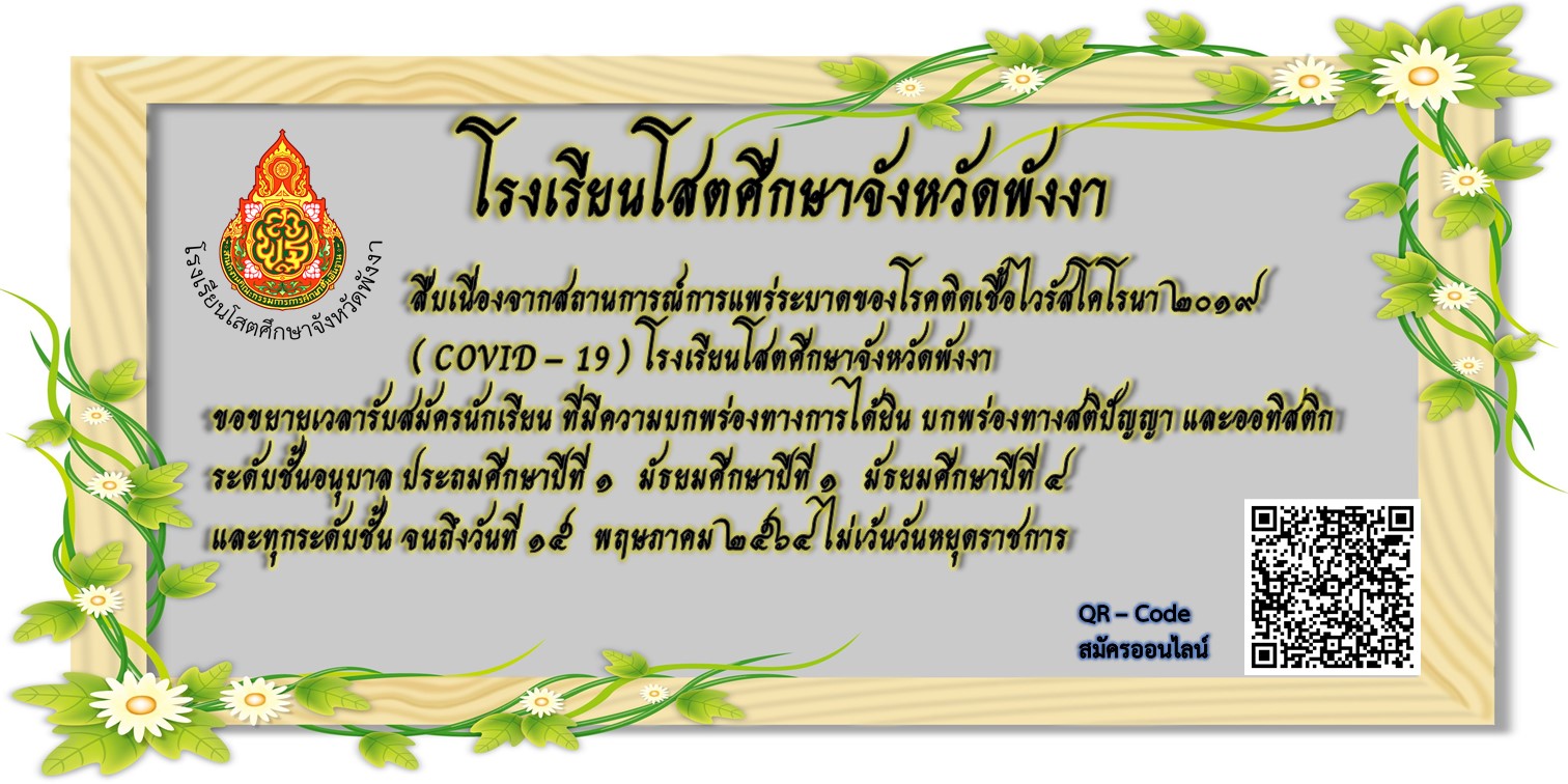 สืบเนื่องจากสถานการณ์การแพร่ระบาดของโรคติดเชื้อไวรัสโคโรนา ๒๐๑๙ ( COVID ? 19 ) โรงเรียนโสตศึกษาจังหวัดพังงา ขอขยายเวลารับสมัครนักเรียน จนถึงวันที่ ๑๕ พฤษภาคม ๒๕๖๔ ไม่เว้นวันหยุดราชการ